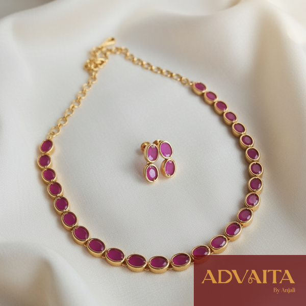 Single Line Goldlookalike Ruby Stone Necklace Set