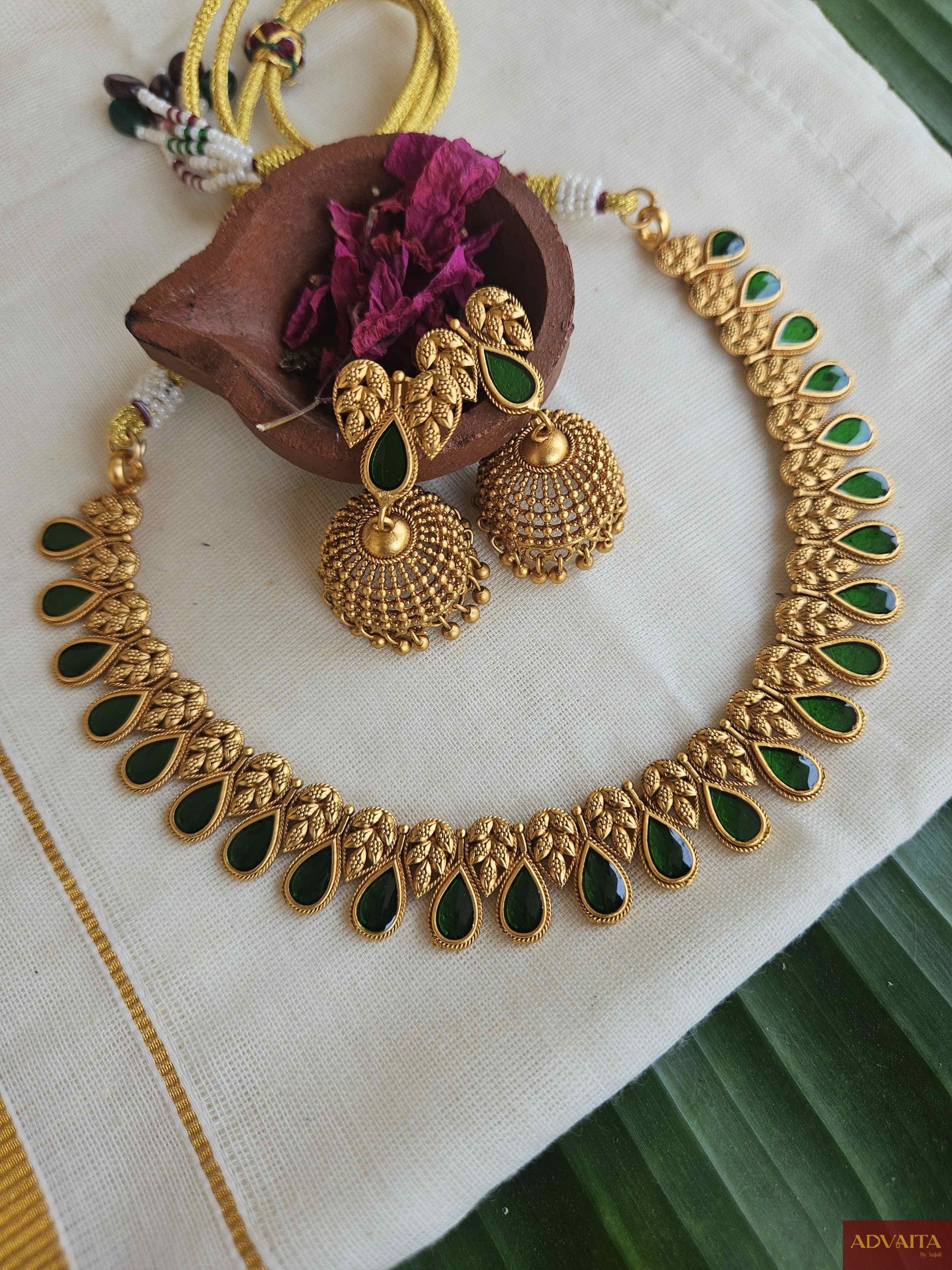 Premium matt finish leaf motif necklace with matching jhumka