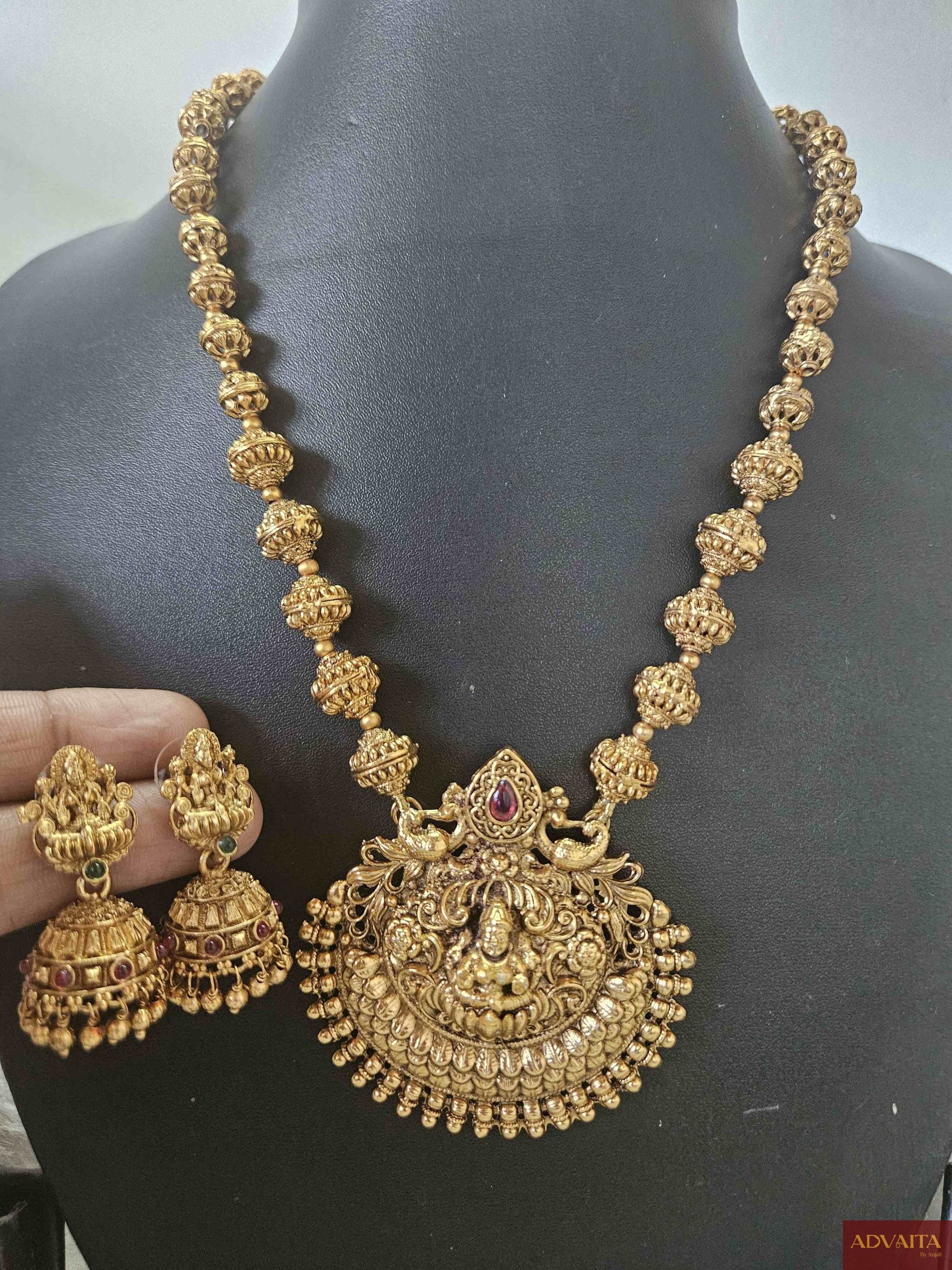 Mattfinish Temple Design Goddess Lakshmi Pendent Chain With Matching Jhumka